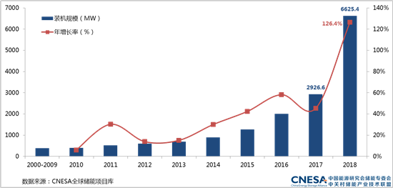 图1:全球电化学储能市场累计装机规模(2000-2018)